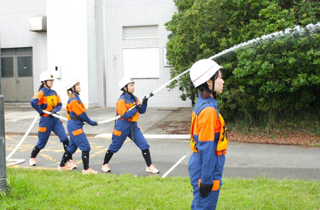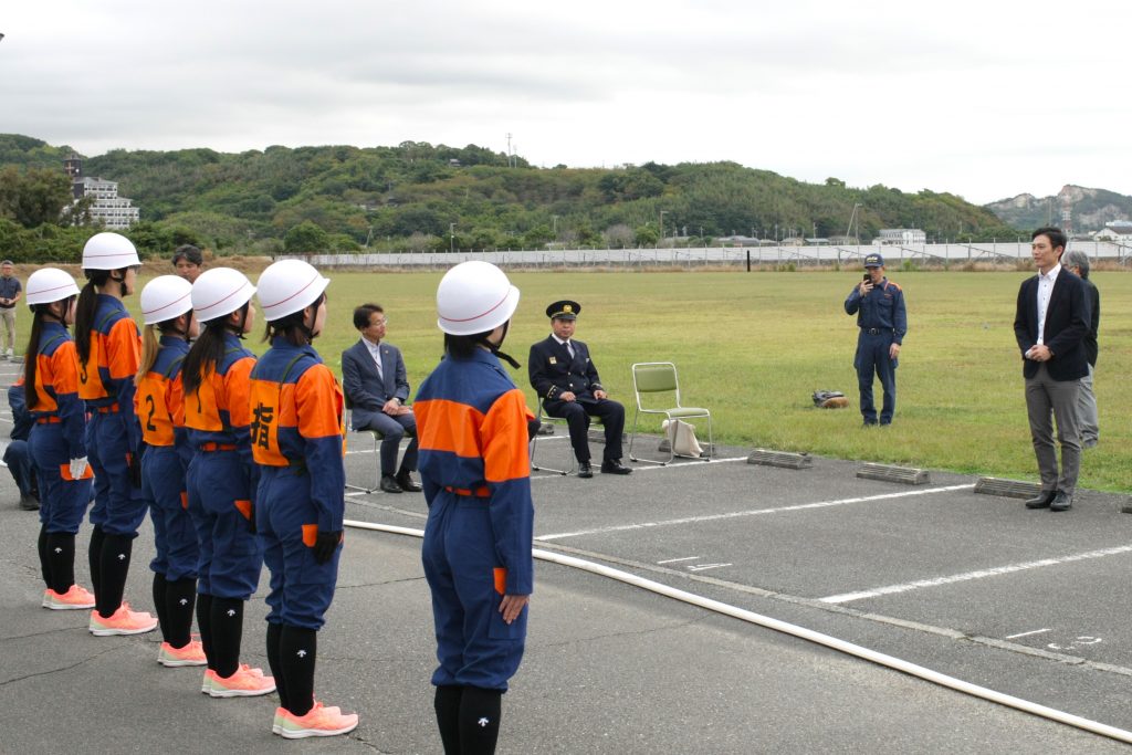 激励会では、出場学生による消防操法のデモンストレーションを実施。