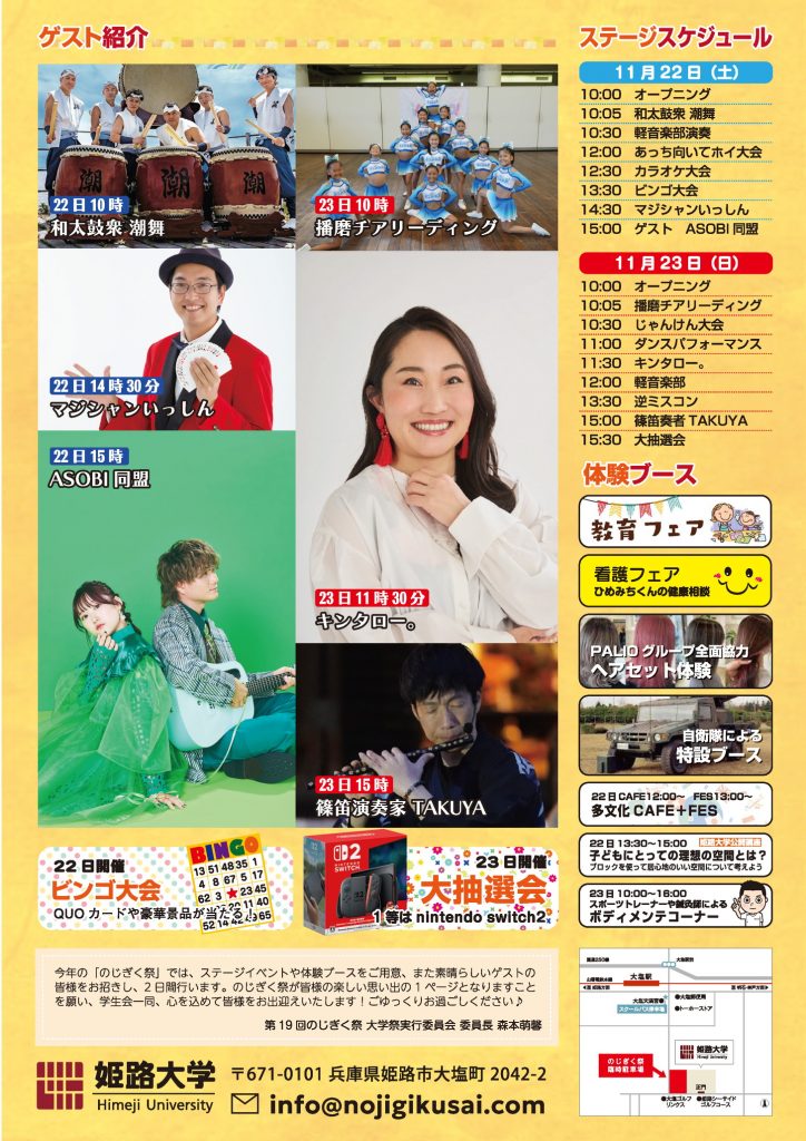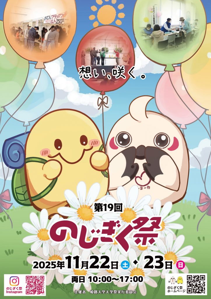 今年度の本学大学祭「第19回 のじぎく祭」は、2025年11月22日(土)、11月23日(日)に開催予定です。