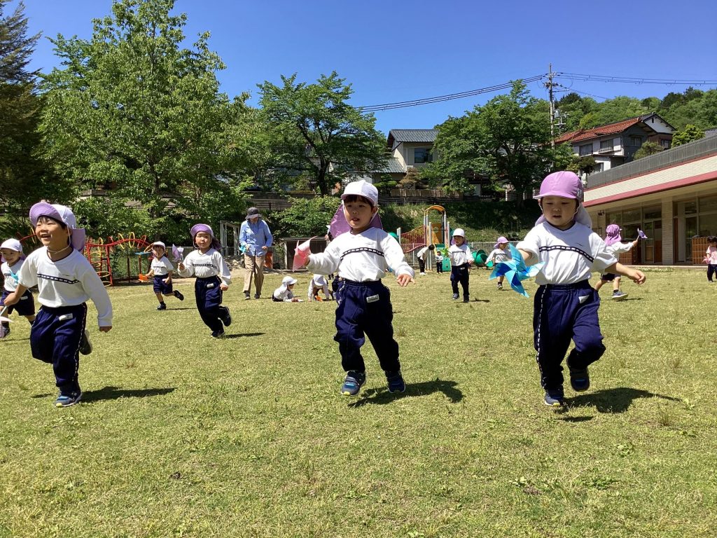 3歳児 自分で模様を描いた風車を持って園庭を走りました。クルクルよく回りました。