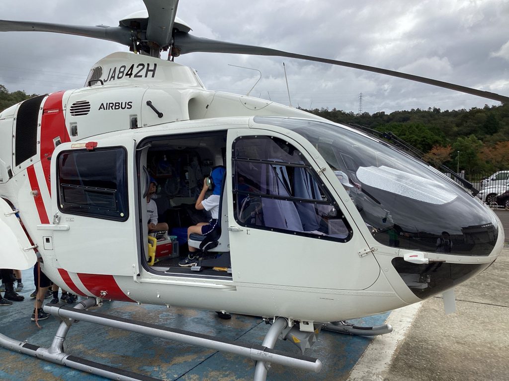 ドクターヘリに乗せてもらうことができました。ヘッドホンも付け、ドクターやヘリの操縦士気分も味わえたかな?