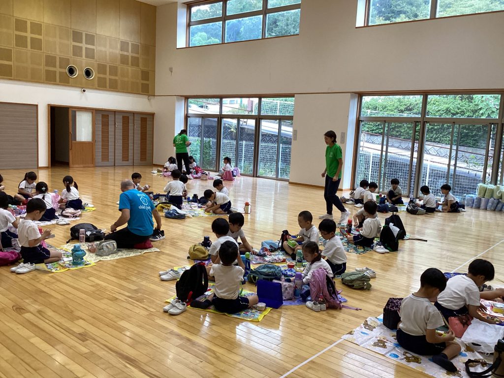 天気の崩れが心配な日だったので、弁当は園に戻ってきて、ホールで食べました。
