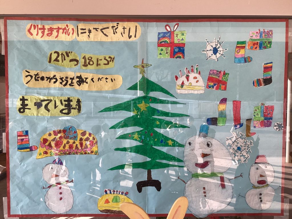 数日前に5歳児がサンタクロースへクリスマス会に招待する手紙を作り、園の玄関に貼って当日を楽しみに待ちました。