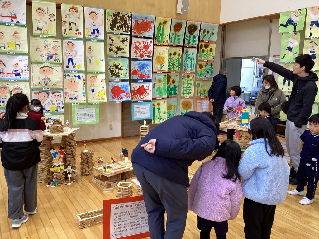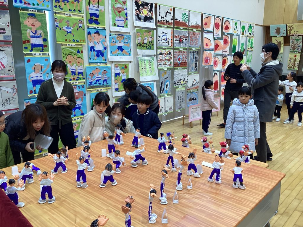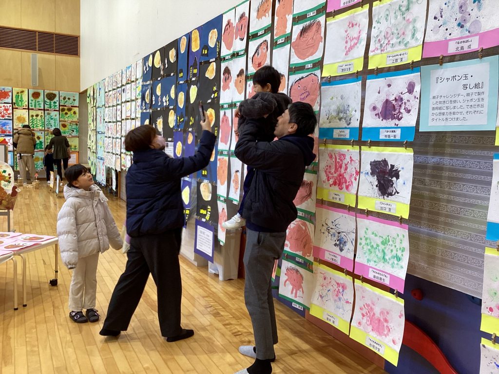 1月30日(土)、3~5歳児の作品展を開催しました。1学期から見たり触ったり経験したり、楽しんできたいろいろな遊びを描画や共同製作などで表した作品を展示し、家族の方に見ていただきました。自分が作ったものを見てもらうのが嬉しくて、「こっち見て!」「これはこうして描いたんだよ」と作ったり描いたりした過程を一生懸命話していました。