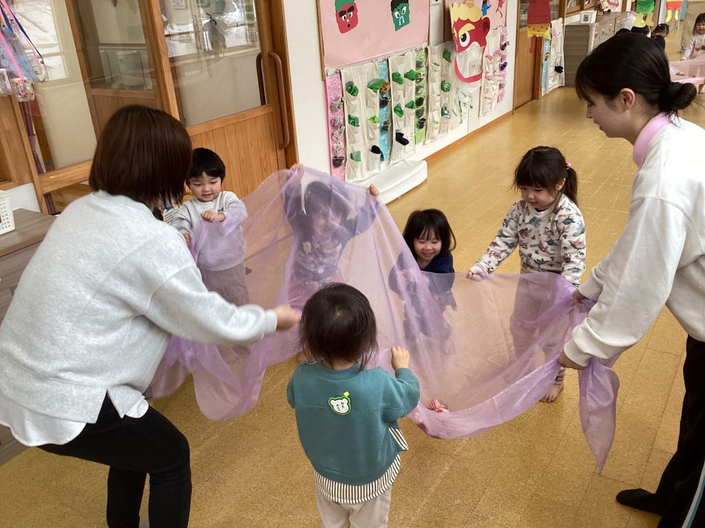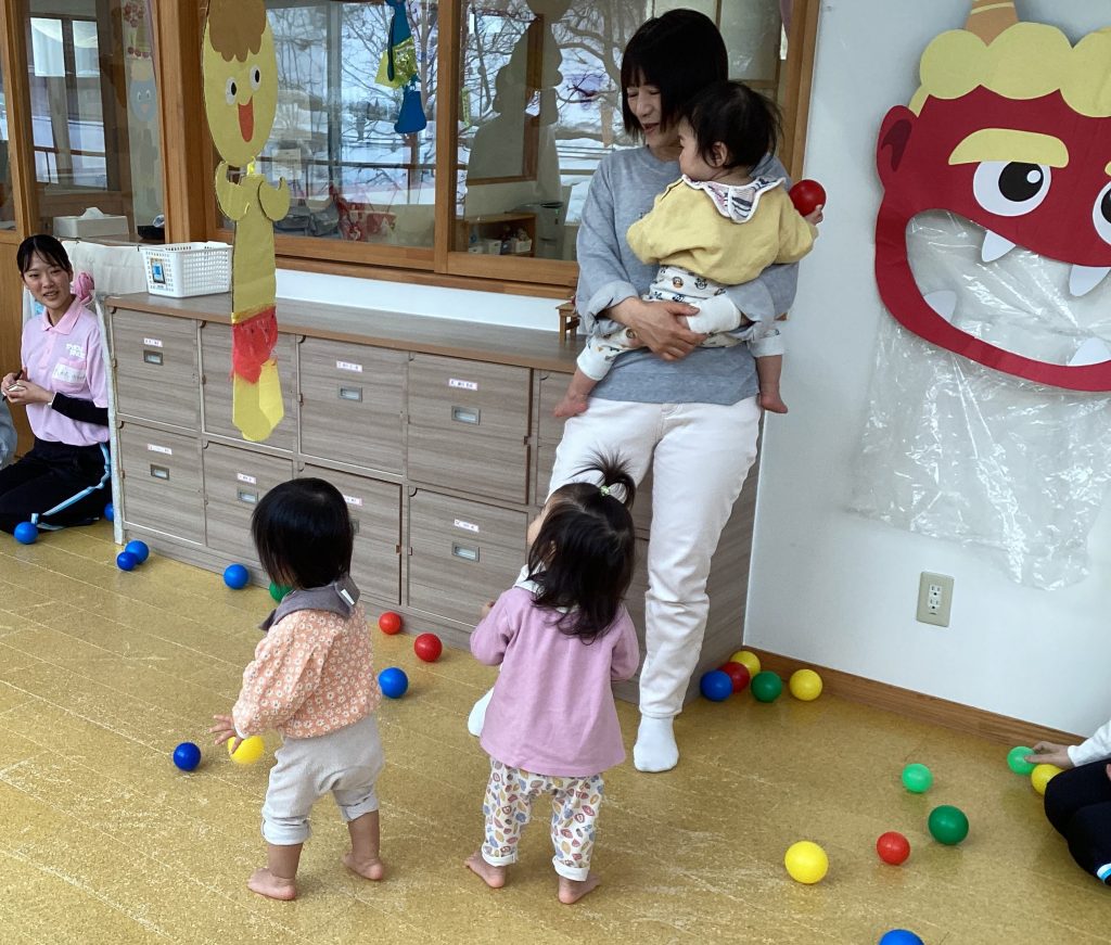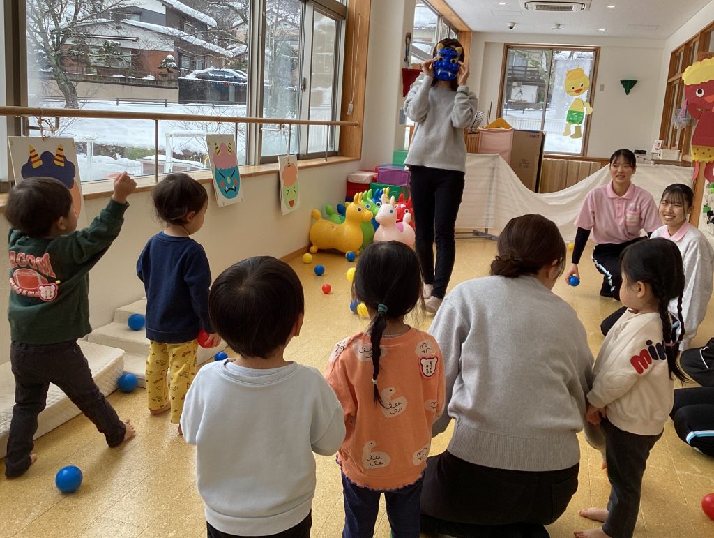 2月3日 0・1歳児、2歳児に分かれ、プレイスペースで節分の会を楽しみました。