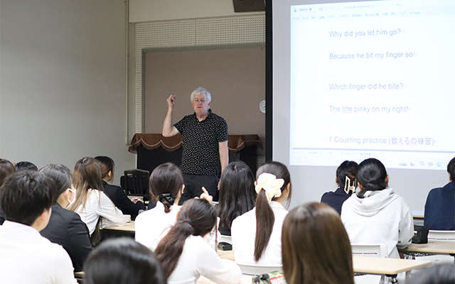 令和7年度の国際交流は、オーストラリア在住のマーティン・ラムジー先生をお招きし、豊岡キャンパス10月3日、姫路キャンパス10月28日に実施しました。両キャンパスともに、1・2年生と教職員が参加し、オーストラリアの文化や幼児教育等について講話をお聞きしました。また、英語での手遊びも体験しました。異文化について楽しく理解を深めることができ、貴重な体験となりました。